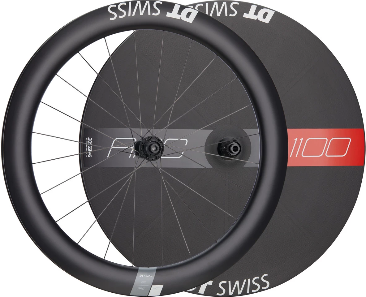 La paire de roues DT Swiss 28″ , composée de la roue avant ARC 1400 DICUT 62 mm et de la roue pleine ARC 1100 DICUT – aérodynamique et propulsion pour les vélos aéro
