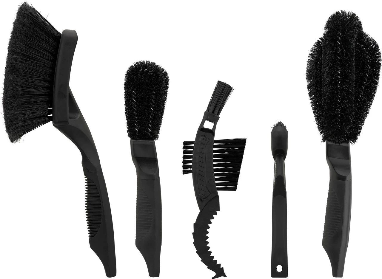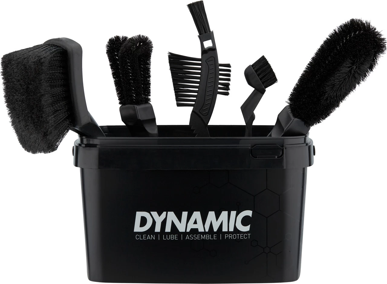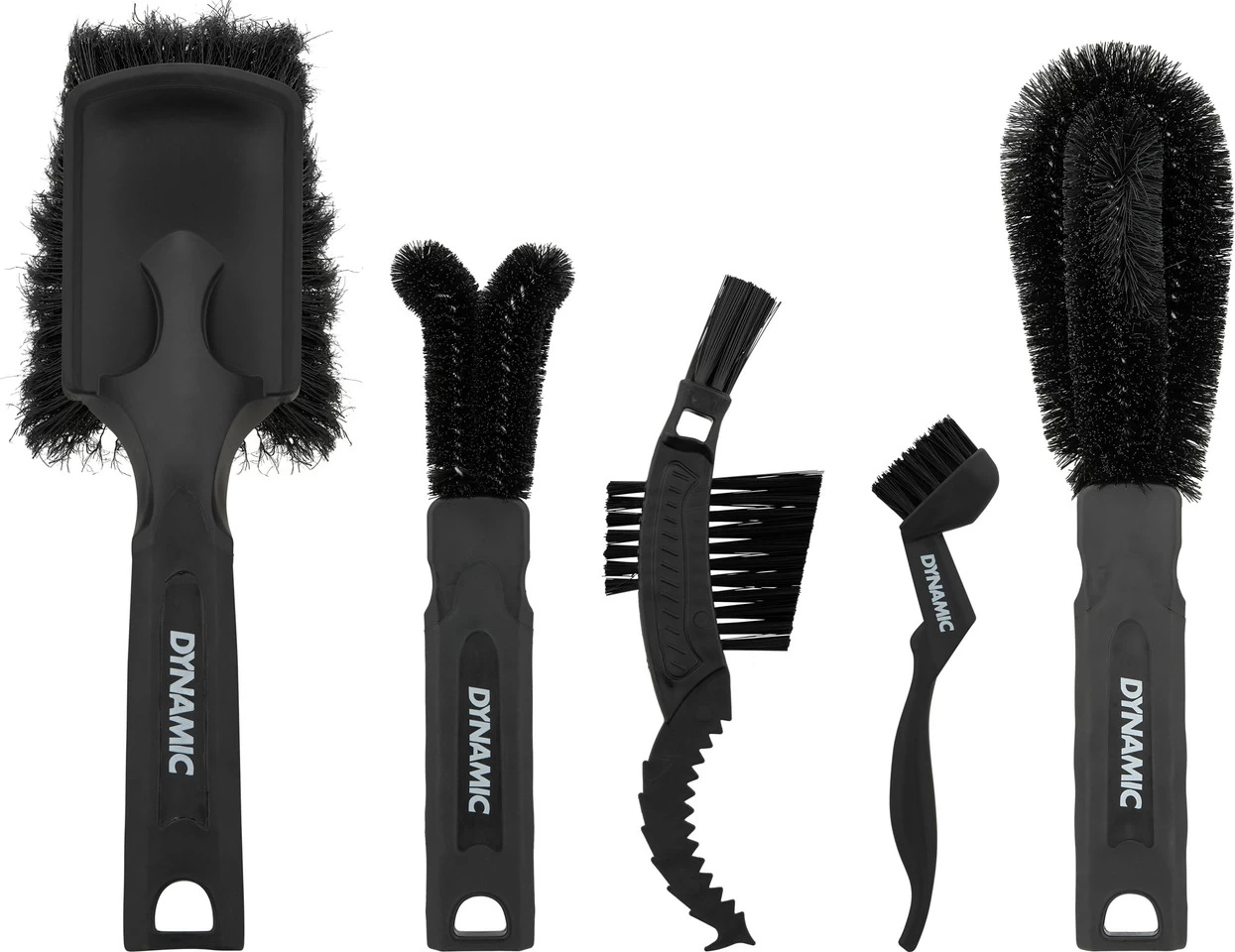 Le kit de brosses Band of Brushes de Dynamic se compose des cinq brosses suivantes : brosse Soft Washing, brosse Wheel and Components, brosse Two Prong, brosse Drivetrain Detailing et brosse Claw. Celles-ci se trouvent dans une boîte pratique pour le rangement. Le kit convient pour le nettoyage complet de ton vélo, du cadre aux composants de la transmission.