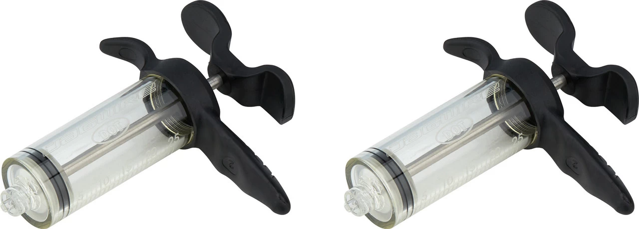 Ces seringues de purge sont des pièces de rechange originales pour le kit Jagwire Elite Bleed. Selon la version, elles sont compatibles avec les systèmes de frein à disque à base d’huile minérale, comme Shimano ou Magura, ou avec les systèmes de frein à disque à base de DOT, comme SRAM ou Hope. C’est reconnaissable à la couleur des joints : rouge pour l’huile minérale, noir pour le DOT.