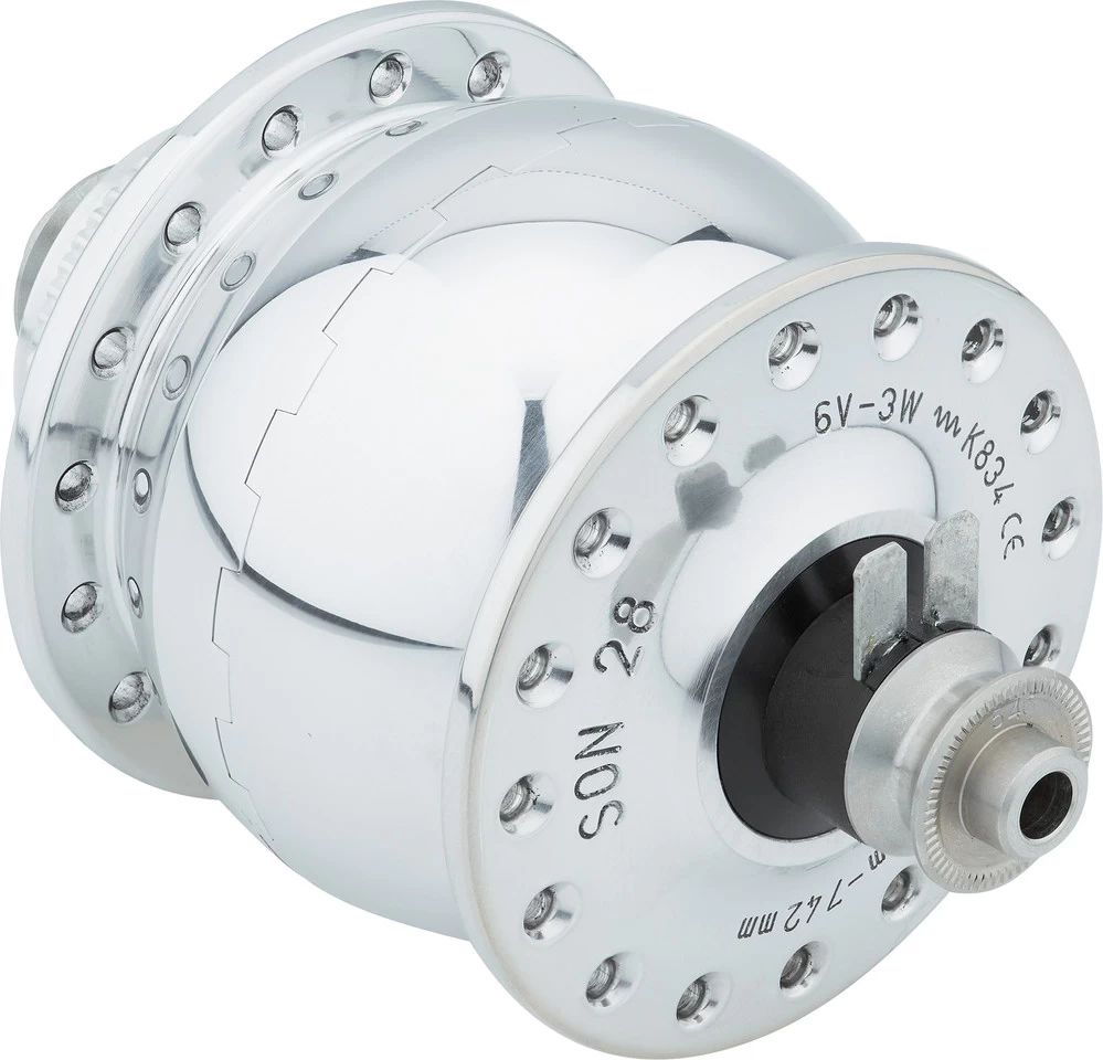 La Son 28 est une dynamo de moyeu universellement approuvée pour toutes les tailles de roues de 16 à 29 pouces. Elle atteint sa puissance nominale dans une roue de 28 pouces à environ 16 km/h. Elle est donc recommandé si un niveau de lumière particulièrement élevé est requis lors d’une conduite lente ou si d’autres appareils doivent être utilisés ou leurs batteries chargées. Par rapport à son prédécesseur Son klassik, les pertes au ralenti ont pu être réduites d’environ 15 % et le poids de 140 g.