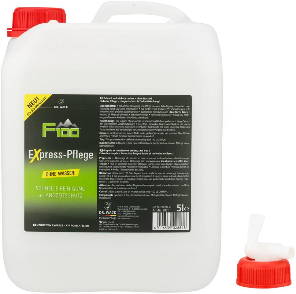 Avec le set de soin express Dr. Wack F100 pour ton atelier, tu peux effectuer de nombreuses opérations de nettoyage sur ton vélo ou nettoyer plusieurs vélos à la fois. Le set comprend 500 ml de produit express et un bidon de 5 litres avec lequel tu peux remplir le vaporisateur encore et encore. Le produit de soin F100 Express de Dr. Wack est produit nettoyant et produit de soin en un. Il peut être utilisé rapidement et facilement sans eau. Les salissures moyennes et légères peuvent être facilement éliminées entre deux grands lavages. Le soin express F100 se caractérise par sa compatibilité matérielle particulièrement élevée. Il n’attaque pas le vernis, protège contre les intempéries et réduit l’adhérence de la saleté. Il suffit de vaporiser, d’essuyer, et le tour est joué !